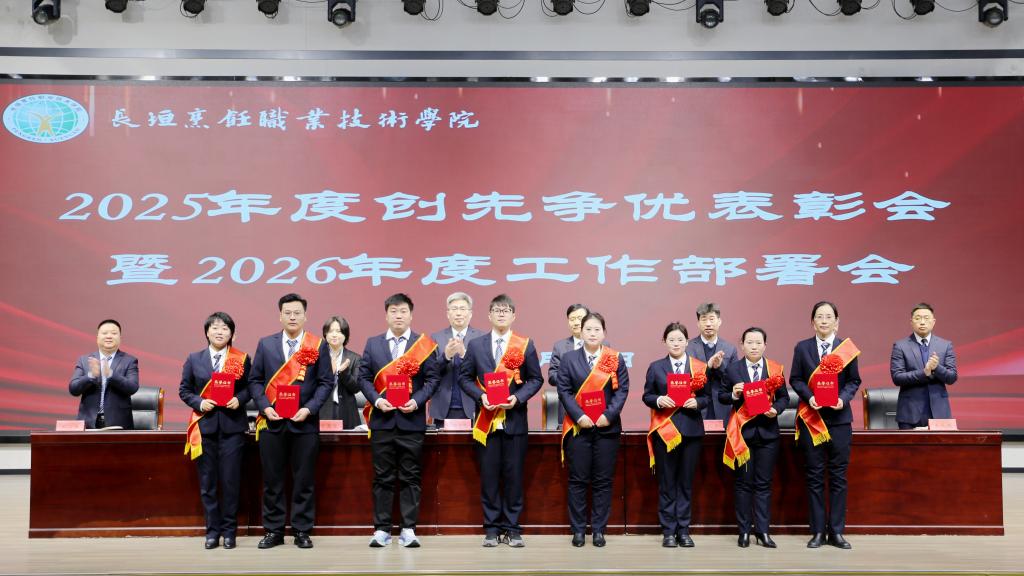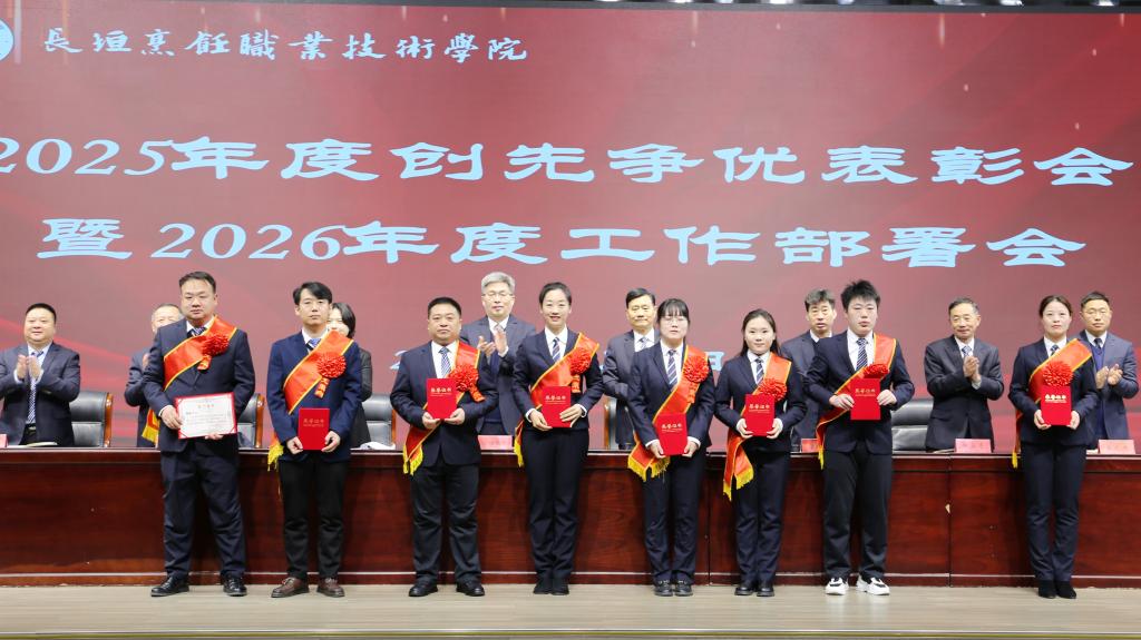 3月8日,我校召开2025年度创先争优表彰会暨2026年度工作部署会,欧阳豫樊、王金台等全体校领导班子成员出席会议,全体教职工参加会议。会议全面总结2025年办学成果,表彰先进集体与先进个人,安排部署2026年重点工作,进一步统一思想、明确方向、压实责任,为学校推进“新双高”建设、创建本科层次职业大学凝聚强大合力。会议由学校常务副校长董现莹主持。