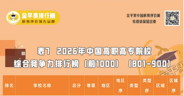 本次排名依托“金平果”2026版中国高职院校竞争力排行榜,该榜单由杭州电子科技大学中国科教评价研究院等联合研发,是连续第十五次发布的高职院校评价结果,以“新双高”建设为背景,从思政建设、办学条件等多维度构建评价体系,具有较高权威性和参考价值。